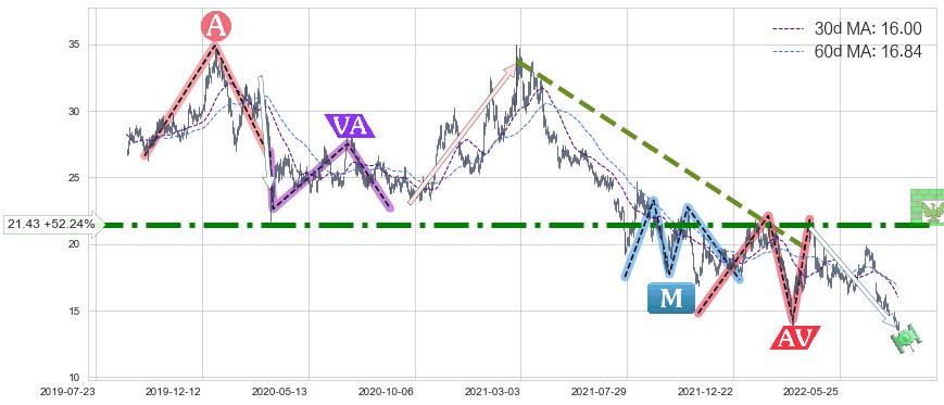 ♘ 阻力价格位21.43,可信任强度87.78%,距离最后交易2022-08-12形成的收盘价格14.08相差 +52.24%