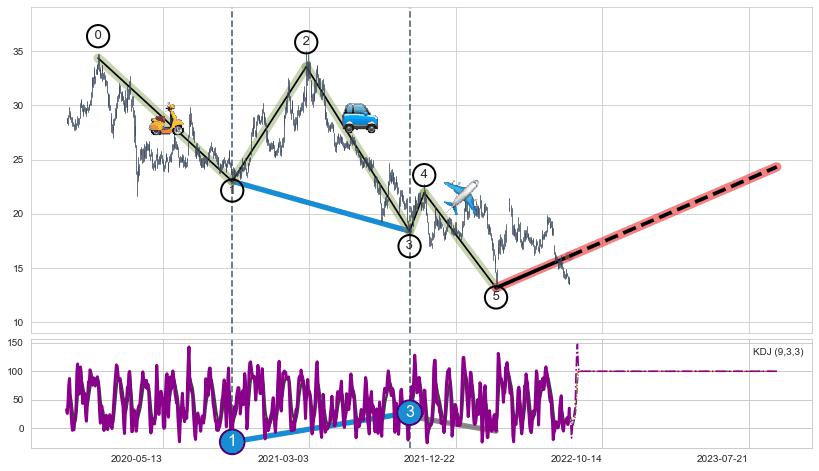 ➢ 第一, 三驱动浪端点:【KDJ】走势出现【常规背离 & 反转信号】背离程度99.00%,背离夹角角度57.4˚,背离程度较大