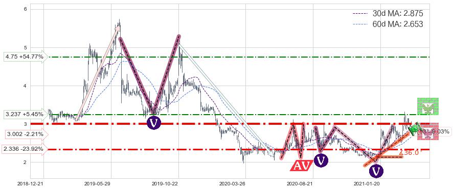 ♘ 支撑价格位3.002,可信任强度72.86%,距离最后交易2021-03-29形成的收盘价格3.070相差 -2.21%
