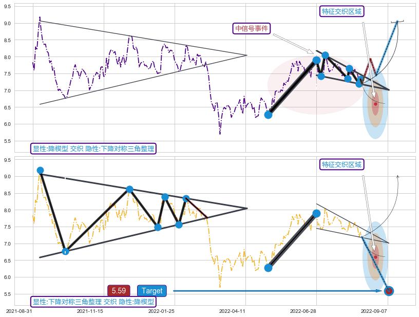 ➢ 降楔型属【中级别信号事件】下降对称三角整理属【长级别信号事件】中长周期组合信号事件,中长事件长度比56.30%