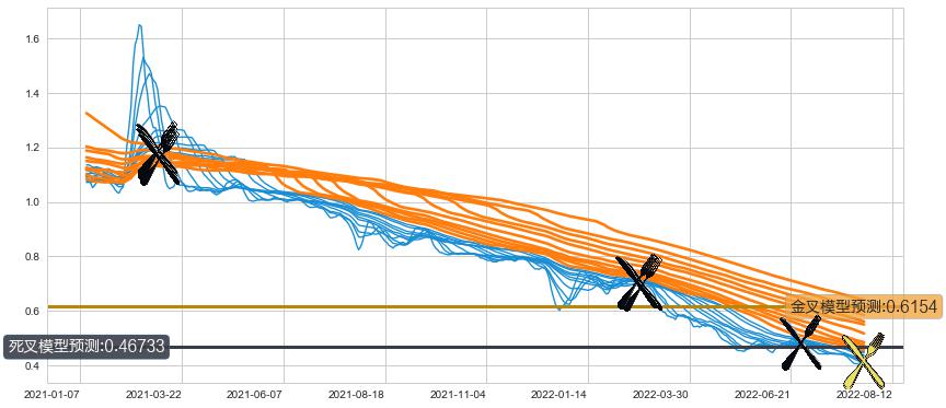 ➣ 40小时均线于(2022-02-21: 0.6998)形成【死叉】基于【死叉历史模型】预测死叉后最低波谷价格: 0.5166, 死叉后最低价格0.37500,已经下跌超出预测最低波谷价格, 预期反弹