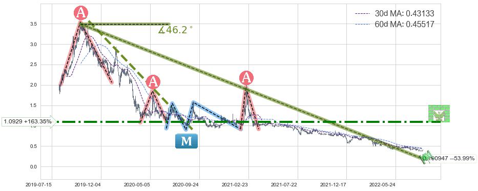 ♘ 在最后的下跌阶段2019-10-04至2022-08-12,存在 破位边缘的阻力位 ,阻力价格0.190947,可信任强度77.15%,其距离最后价格0.41500相差 -53.99%