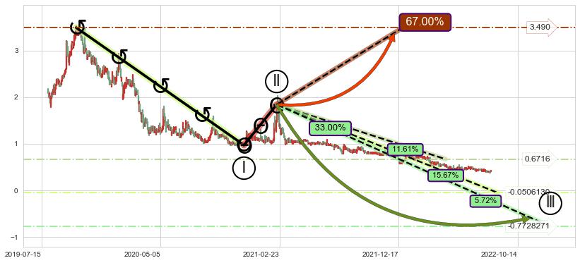 ➣ 调整浪已超过预测的c点位置,但后续大趋势循环浪高概率反转上涨,继续下跌概率33.00%,谨慎做空