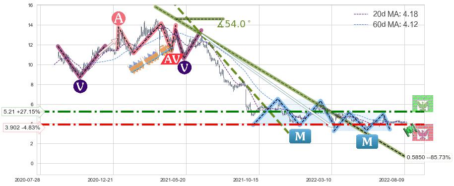♘ 阻力价格位5.21,可信任强度80.59%,距离最后交易2022-08-12形成的收盘价格4.10相差 +27.15%