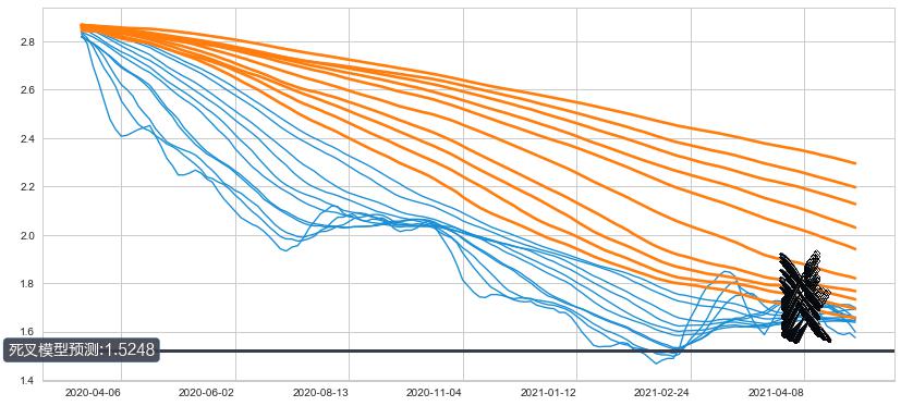 ➣ 60小时均线于(2021-04-08: 1.6667)形成【死叉】基于【死叉历史模型】预测死叉后最低波谷价格: 1.4188, 死叉后最低价格1.5000,尚未达到预测最低波谷价格, 预期继续下跌