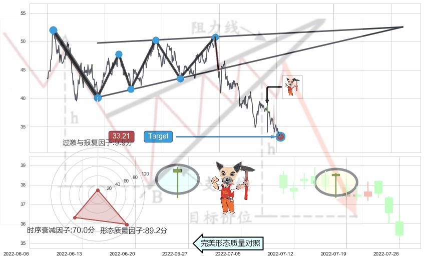 ➢ 锤头线(锤子线) 🔜 升楔型临近target支撑拐点上涨 综合量化分数:53.77 【偏多】