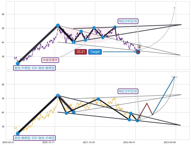➣ 锤头线(锤子线) + 升楔型临近target支撑拐点上涨信号叠加后【目标达成率】中等,【看多】信号叠加【存续影响中等】