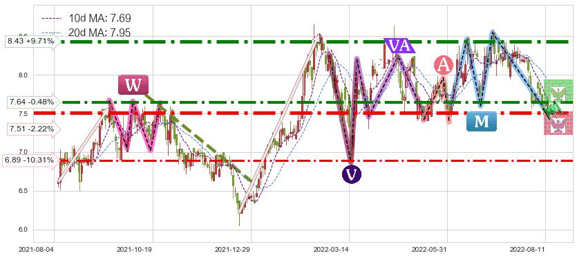 ♘ 阻力价格位7.64,可信任强度84.89%,距离最后交易2022-08-12形成的收盘价格7.68相差 -0.48%
