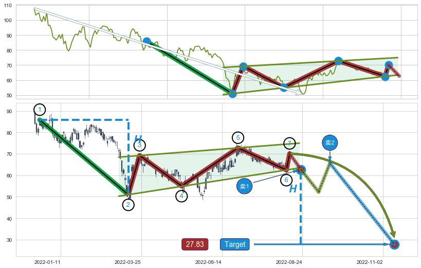 ➣ 最小中继整理跌幅→𝐇: 34.85 (𝐇旗杆的长度:旗杆起点→顶点)