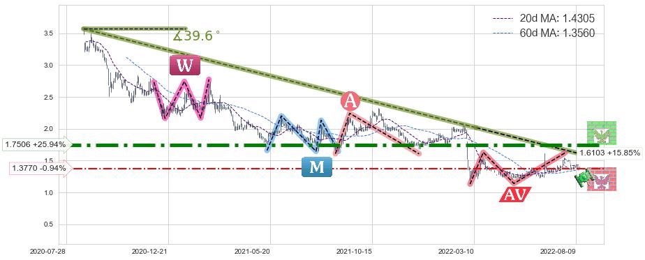 ♘ 阻力价格位1.7506,可信任强度88.45%,距离最后交易2022-08-12形成的收盘价格1.3900相差 +25.94%