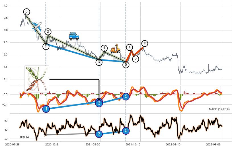 ➣ 第一, 三, 五浪下跌动能逐渐【衰弱变小】,趋势呈现不稳迹象