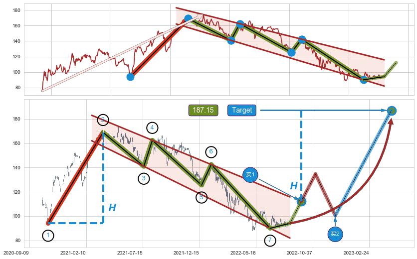 ➣ 升楔型:猜想下跌target达成后 → 上涨 → 机会信号 → 大趋势均值回复