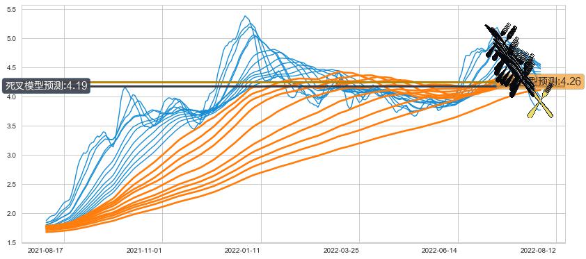 ➣ 80小时均线于(2022-07-29: 4.27)形成【死叉】基于【死叉历史模型】预测死叉后最低波谷价格: 3.899, 死叉后最低价格3.680,已经下跌超出预测最低波谷价格, 预期反弹