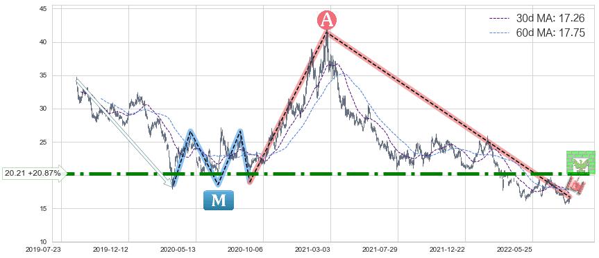 2022-06-28: 第一阻力位20.21强力阻拦了上升趋势,成功阻止了价格的继续上涨。
