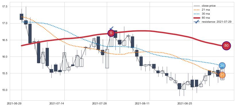 ➣ 21小时均线于(2022-07-12: 12.92)形成【死叉】基于【死叉历史模型】预测死叉后最低波谷价格: 11.78, 死叉后最低价格10.92,已经下跌超出预测最低波谷价格, 预期反弹
