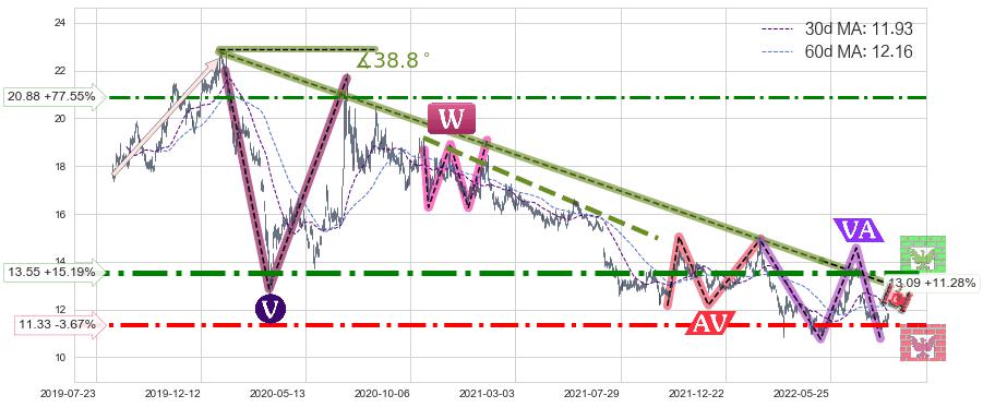 ♘ 支撑价格位11.33,可信任强度73.03%,距离最后交易2022-08-12形成的收盘价格11.76相差 -3.67%