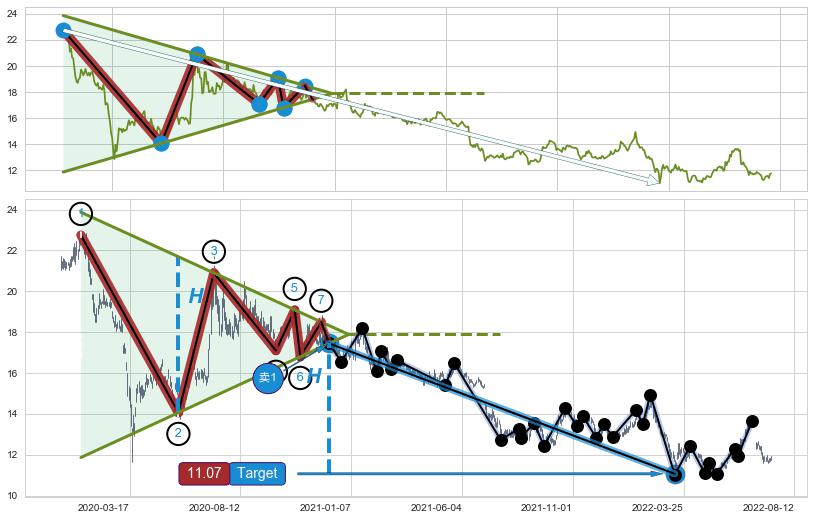➢ 最小中继整理跌幅→𝐇: 7.63 (低点逐步抬高斜边第一支撑点②与阻力边垂直距离)