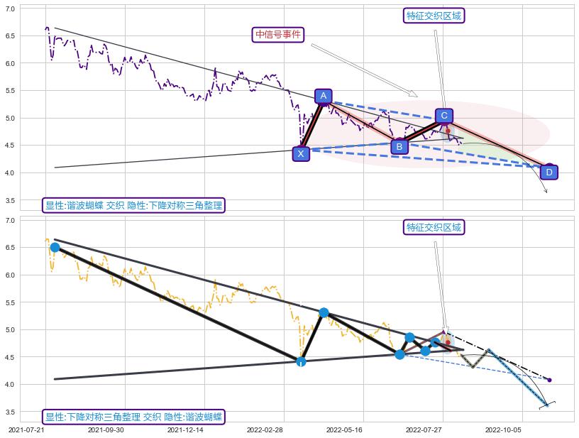 ➢ 谐波蝴蝶属【中级别信号事件】下降对称三角整理属【长级别信号事件】中长周期组合信号事件,中长事件长度比40.80%