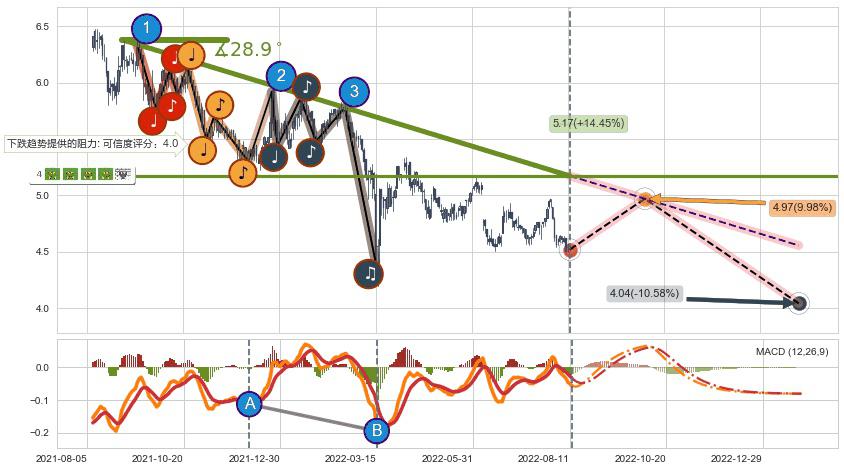 ♘ 在最后的下跌阶段2021-08-31至2022-07-19,存在 持续未破位的阻力位 ,阻力价格5.17,可信任强度83.70%,其距离最后价格4.52相差 +14.45%
