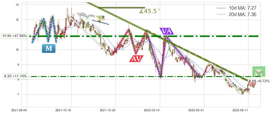 ♘ 阻力价格位10.90,可信任强度97.19%,距离最后交易2022-08-12形成的收盘价格7.38相差 +47.65%
