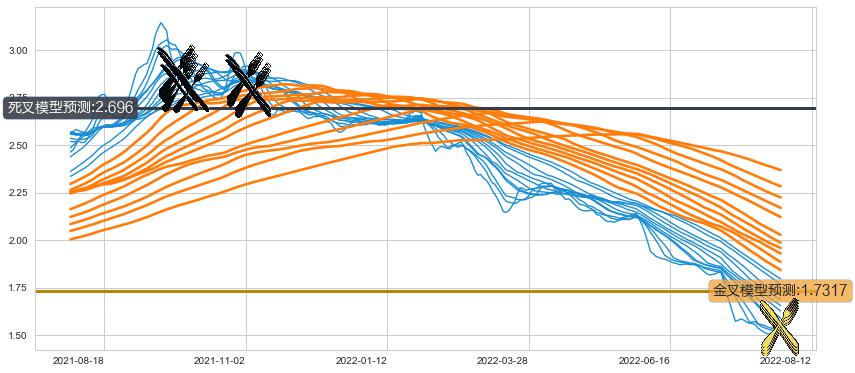 ➣ 40小时均线于(2021-09-24: 2.803)形成【死叉】基于【死叉历史模型】预测死叉后最低波谷价格: 2.700, 死叉后最低价格1.4900,已经下跌超出预测最低波谷价格, 预期反弹