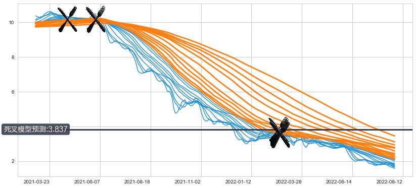 ➣ 70小时均线于(2021-04-20: 10.12)形成【死叉】基于【死叉历史模型】预测死叉后最低波谷价格: 9.31, 死叉后最低价格1.5100,已经下跌超出预测最低波谷价格, 预期反弹