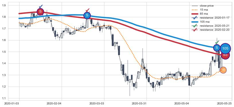 ➢ 最优均线组合共正确确认支撑阻力信号10处,正确确认率 71.43%
