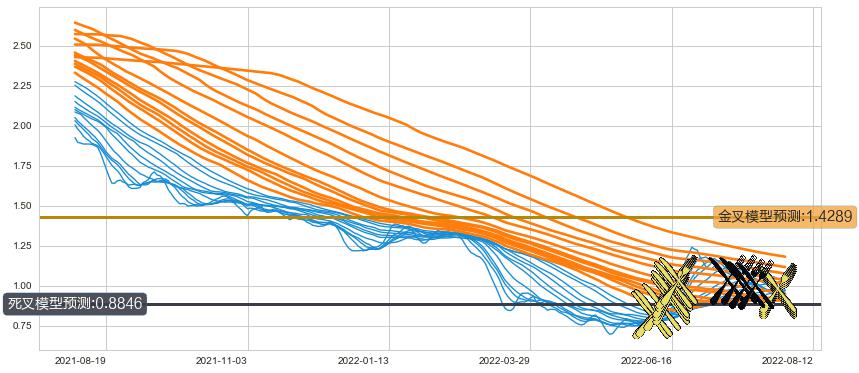 ➣ 34小时均线于(2022-07-20: 1.0265)形成【死叉】基于【死叉历史模型】预测死叉后最低波谷价格: 0.9169, 死叉后最低价格0.8700,已经下跌超出预测最低波谷价格, 预期反弹