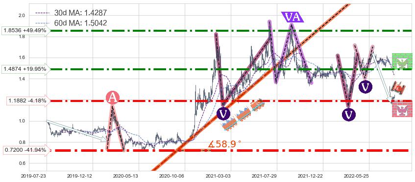 ♘ 阻力价格位1.4874,可信任强度71.72%,距离最后交易2022-08-12形成的收盘价格1.2400相差 +19.95%