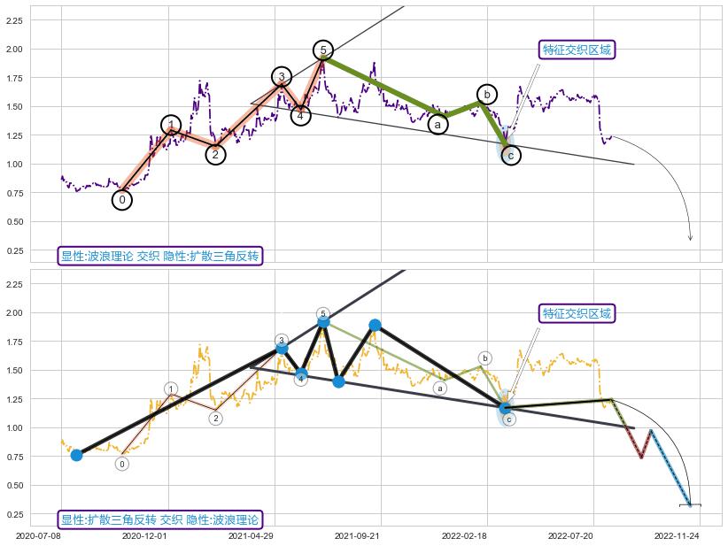 ➢ 波浪理论与扩散三角反转信号事件周期长度级别相同,同周期信号事件
