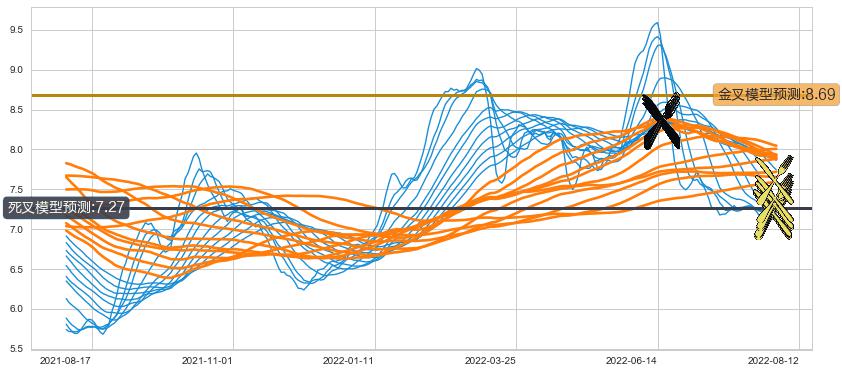 ➣ 55小时均线于(2022-06-15: 8.35)形成【死叉】基于【死叉历史模型】预测死叉后最低波谷价格: 7.32, 死叉后最低价格6.98,已经下跌超出预测最低波谷价格, 预期反弹