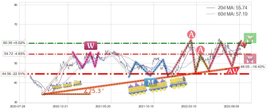 ♘ 支撑价格位54.72,可信任强度65.31%,距离最后交易2022-08-12形成的收盘价格57.50相差 -4.83%