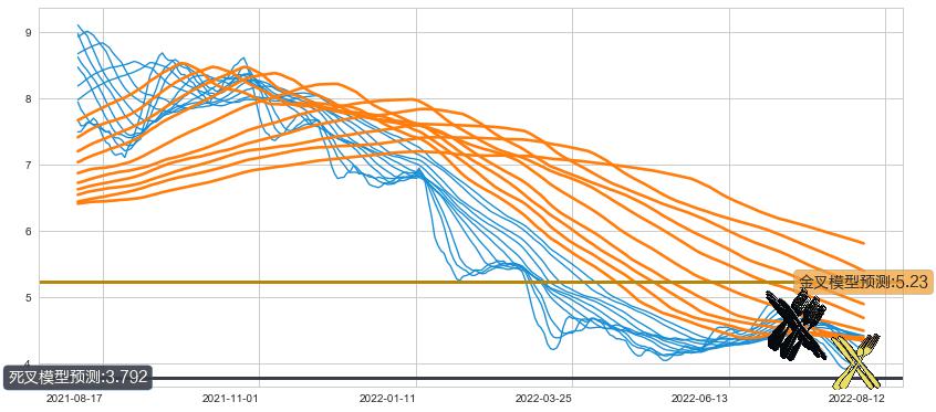 ➣ 34小时均线于(2022-07-11: 4.59)形成【死叉】基于【死叉历史模型】预测死叉后最低波谷价格: 4.04, 死叉后最低价格3.840,已经下跌超出预测最低波谷价格, 预期反弹
