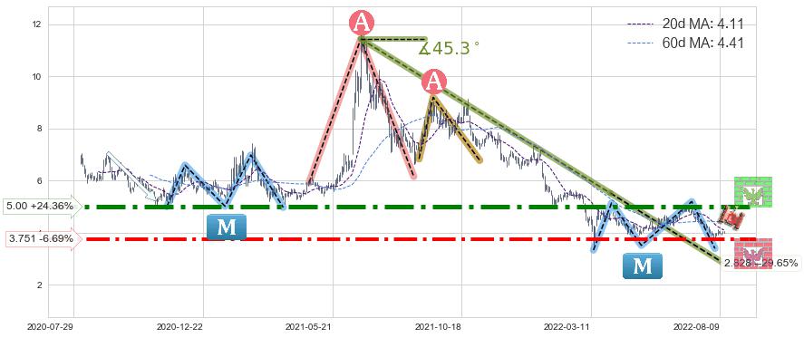♘ 阻力价格位5.00,可信任强度88.95%,距离最后交易2022-08-12形成的收盘价格4.02相差 +24.36%
