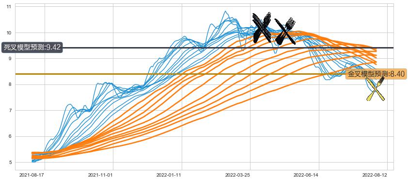 ➢ 10小时均线于(2022-08-11: 7.82)形成【金叉】基于【金叉历史模型】预测金叉后最高波峰价格: 8.40, 金叉后最高价格7.80,尚未达到预测最高波峰价格, 预期继续上涨
