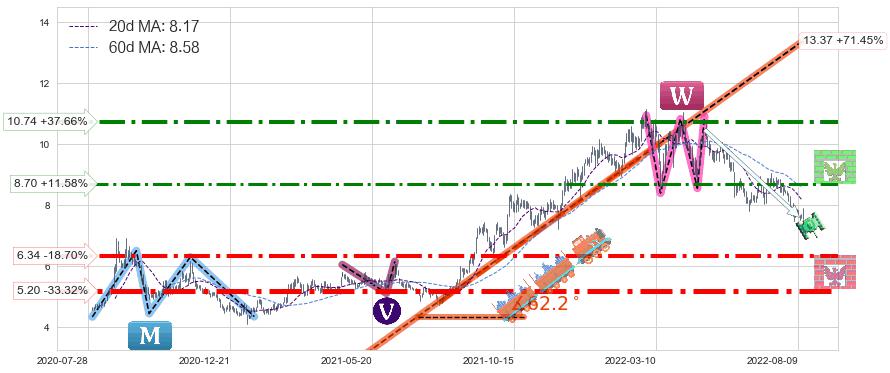 ♘ 阻力价格位10.74,可信任强度77.63%,距离最后交易2022-08-12形成的收盘价格7.80相差 +37.66%