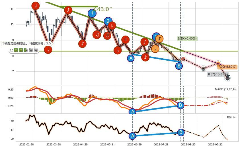 ➣ 预测:2022-09-19,【试探阻力】稳定目前下跌趋势的前提下,预测价格:7.50