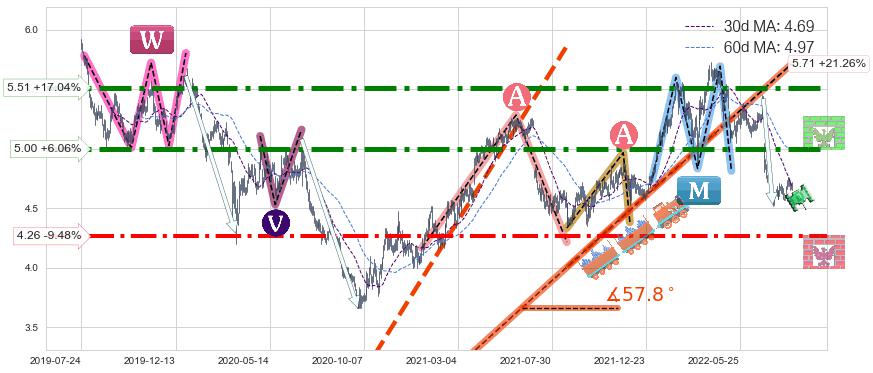 ♞ 30日均线:4.69,60日均线:4.97→ 快线<慢线