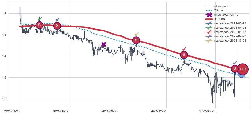 ➢ 110小时均线于(2021-03-24: 1.6788)形成【死叉】基于【死叉历史模型】预测死叉后最低波谷价格: 1.4103, 死叉后最低价格0.9300,已经下跌超出预测最低波谷价格, 预期反弹