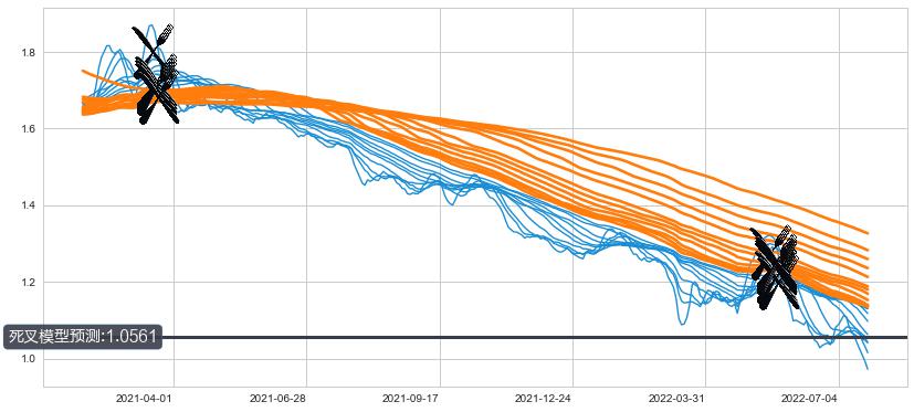 ➣ 40小时均线于(2022-05-18: 1.1947)形成【死叉】基于【死叉历史模型】预测死叉后最低波谷价格: 0.9783, 死叉后最低价格0.9300,已经下跌超出预测最低波谷价格, 预期反弹