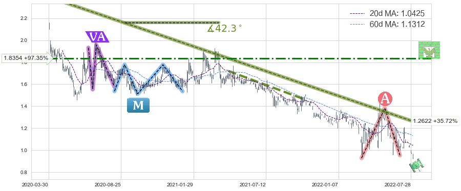 从2020-03-31至2022-08-11,共包含503个交易日,阶段股价下跌-61.88%,阶段股价变动位移路程比: 1 : 15,下跌趋势角度: 42.3