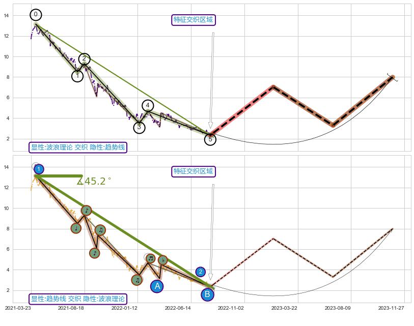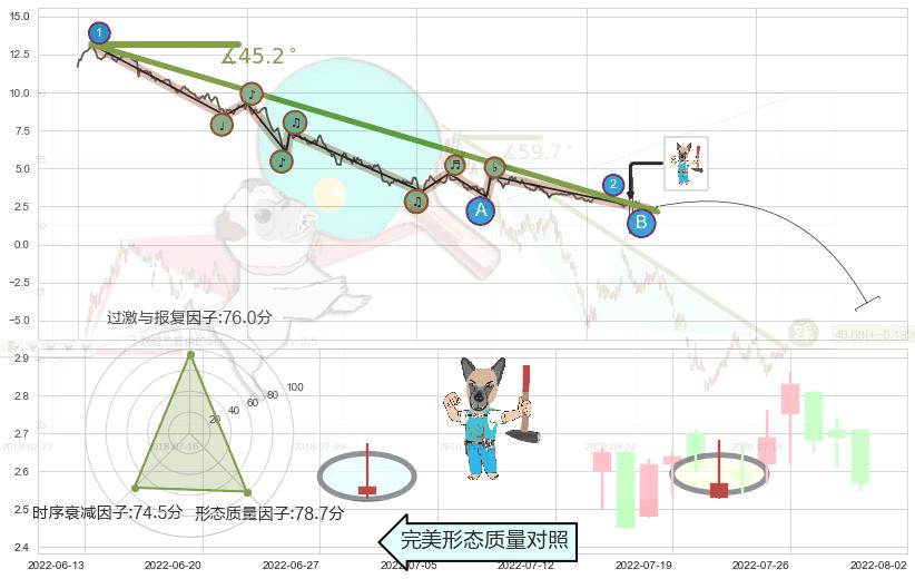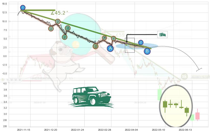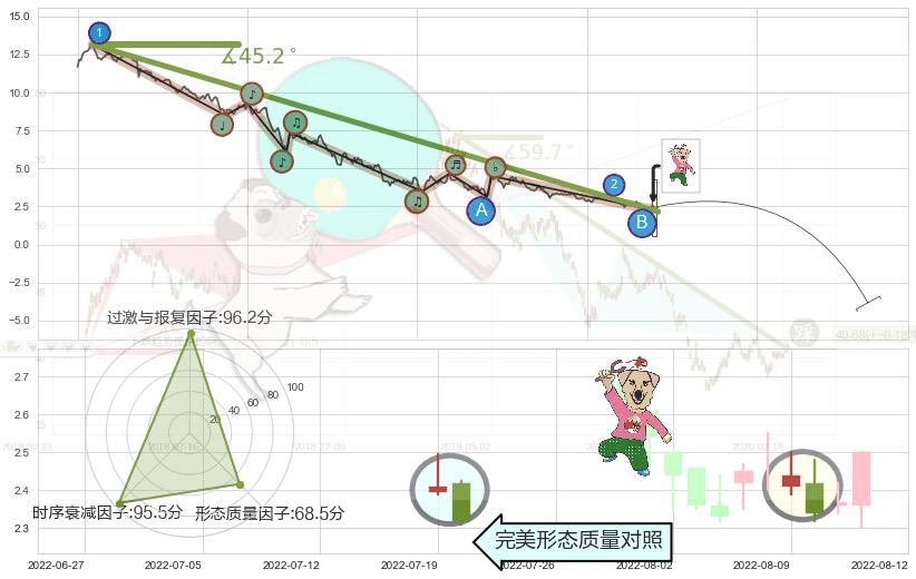 从2021-04-08至2022-08-12,共包含334个交易日,阶段股价下跌-139.65%,阶段股价变动位移路程比: 1 : 6,下跌趋势角度: 45.2