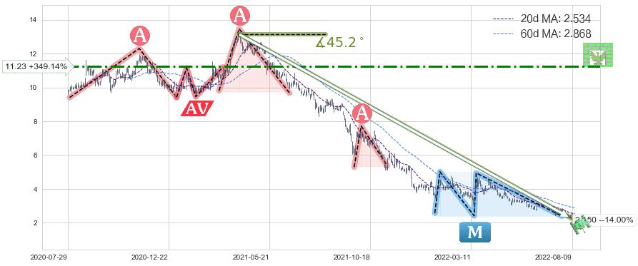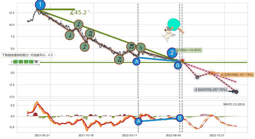 ♘ 在最后的下跌阶段2021-04-08至2022-08-12,存在 破位边缘的阻力位 ,阻力价格2.150,可信任强度83.36%,其距离最后价格2.500相差 -14.00%