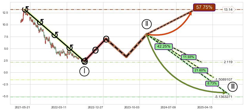 ➣ 波浪理论:猜想止跌 → 上涨 →【拐点】浪5已完成 → 大趋势均值回复