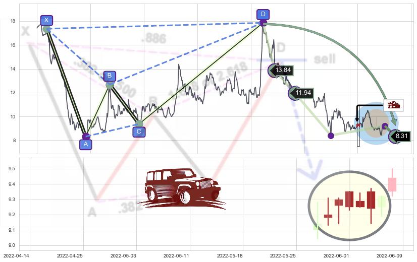 ➢ 谐波蝙蝠:d下跌即将临近第❸目标:猜想支撑拉升 → 上涨 →【拐点】机会信号 → 大趋势均值回复