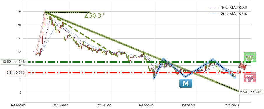 ♘ 阻力价格位10.52,可信任强度84.95%,距离最后交易2022-08-12形成的收盘价格9.21相差 +14.21%