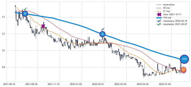 ➢ 21小时均线于(2022-06-27: 0.7238)形成【金叉】基于【金叉历史模型】预测金叉后最高波峰价格: 0.8438, 金叉后最高价格0.8600,虽然已经到达预测最高波峰价格,但耗时间很短动能很强, 预期继续上涨