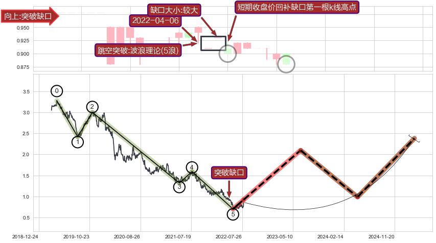 ➢ 突破缺口形成后,后续k已经超过14根,跳空突破波浪理论(5浪)关键点后, 出现【完全回踩】迹象,短期收盘价回补缺口第一根k线高点