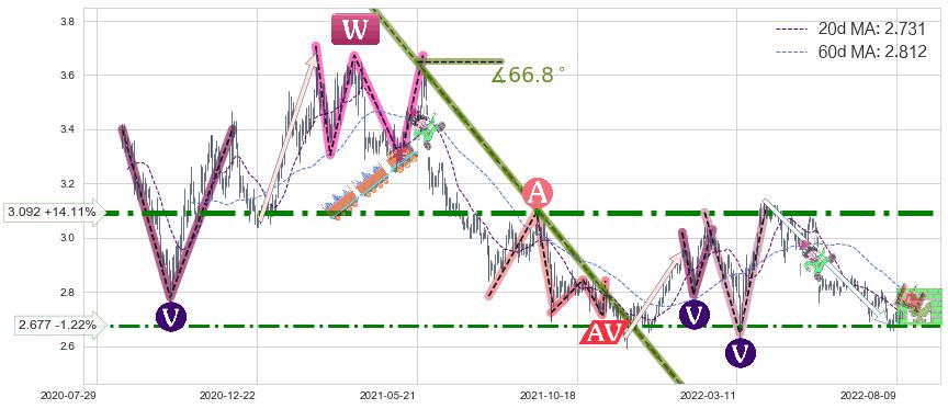 ♘ 阻力价格位3.092,可信任强度94.35%,距离最后交易2022-08-12形成的收盘价格2.710相差 +14.11%