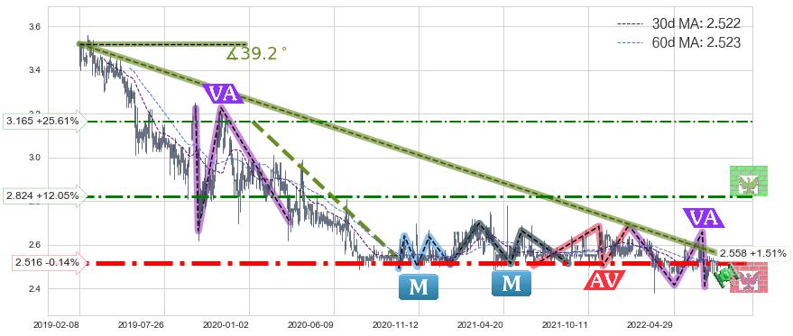 ♘ 阻力价格位2.824,可信任强度64.25%,距离最后交易2022-08-12形成的收盘价格2.520相差 +12.05%